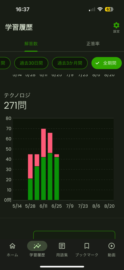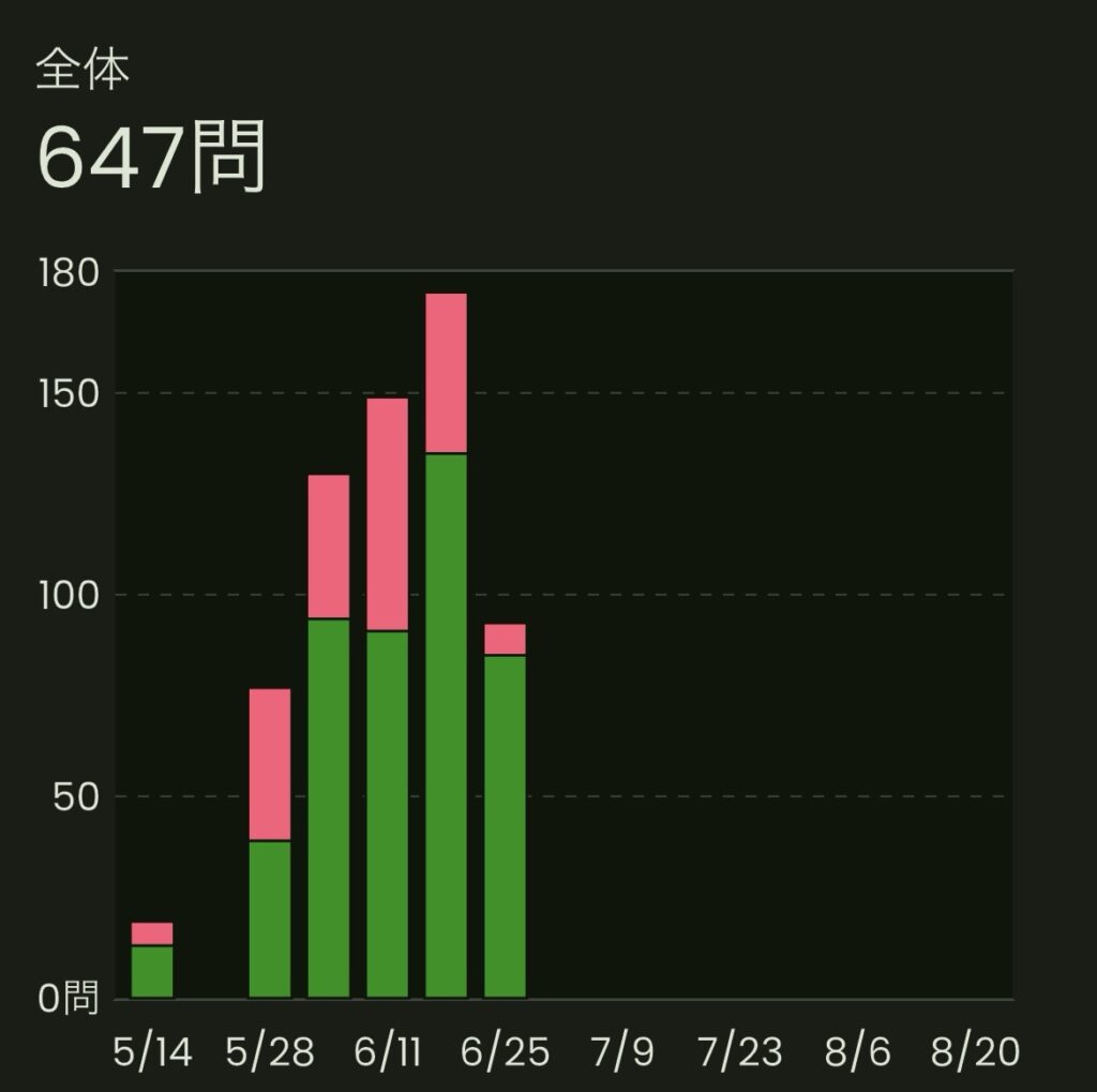 アプリで解いた問題数を確認する  数字として積み上がっていくのを見ると、「今日も一歩前進できた」と実感できます。 正答率の上昇を確認する  たとえ1%の変化でも「昨日よりできている」とわかると、自信につながります。 勉強時間や日数をカウントする  「累計でこれだけの時間を投資した」という事実が、挫折しそうな時の支えになります。 学びの振り返りをする  「今まで知らなかったことを理解できた」という成長を言葉にすると、学びの価値を再確認できます。