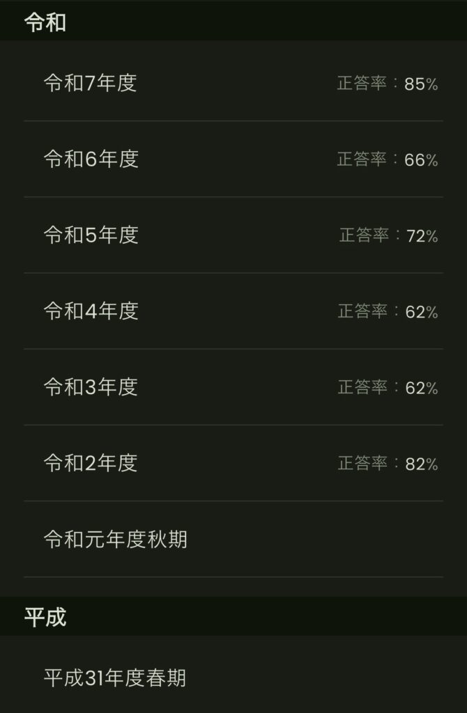 過去問は令和2年度〜令和7年度の問題を解きました。直近の5年分くらいで十分かなと思いました。