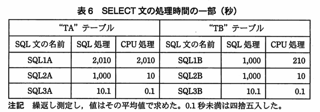 表6「SELECT文の処理時間の一部(秒)」から、次のようになっている。