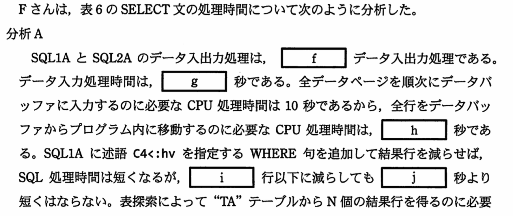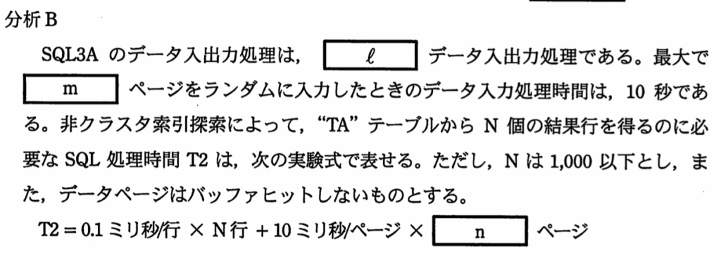 分析Aの中で、「全データページを順次にデータバッファに入力するのに必要なCPU処理時間を10秒」とあり、CPU処理時間も、「入力」と「出力」に分かれると考えられ、CPU入力処理時間は10秒と分かる。
