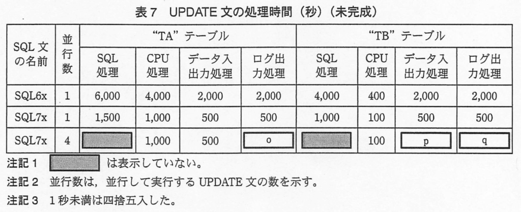 【o】CPU時間、データ入出力時間が共に4分の1になるが、ログファイルは1個しかないので、SQL6Aと同じになるので、”TA”テーブルに対するSQL6xのログ出力処理時間と同じ”2,000”になる。