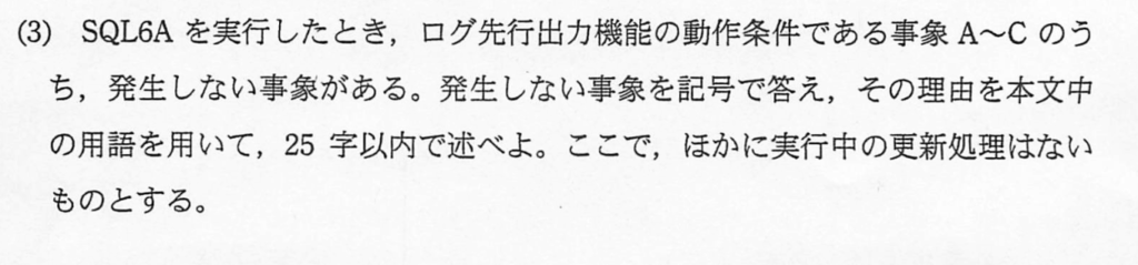 | 3. この問題での関わり | SQL1A/2Aの表探索により、ディスクからデータページがここに読み込まれる。設問 g や h の計算の起点となる。 | SELECT文では、通常、関わらない(更新がないためログの書き込みは発生しない)。UPDATE/INSERT/DELETEで重要となる。 |