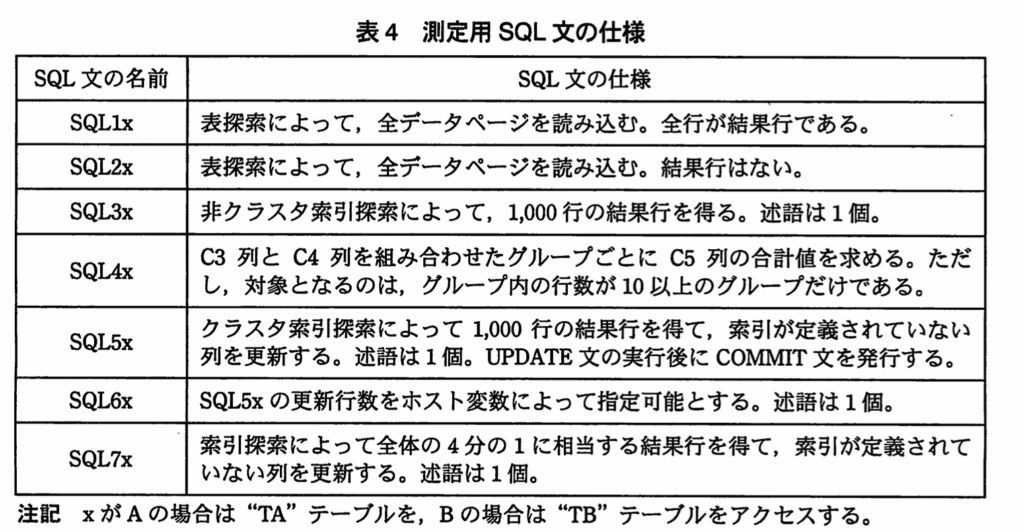 対象のSQL1AとSQL2Aの仕様は、表4「測定用SQL文の仕様」を確認すると、次のようになっている。