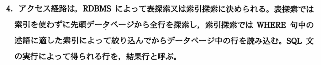 〔RDBMSの主な仕様〕4.で「表探索は、索引を使わずに先頭データページから全行を探索」とある。
