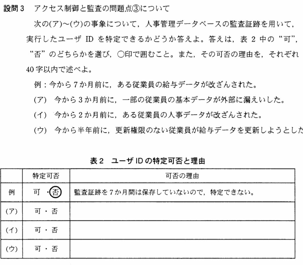 (イ)今から2ヶ月前に、ある従業員の人事データが改竄された。