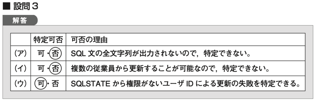 | SQL操作 | 問われる事象 | ログに残る情報(特定できること) | ログに残らない情報(特定できない理由) | 試験の解答ポイント |