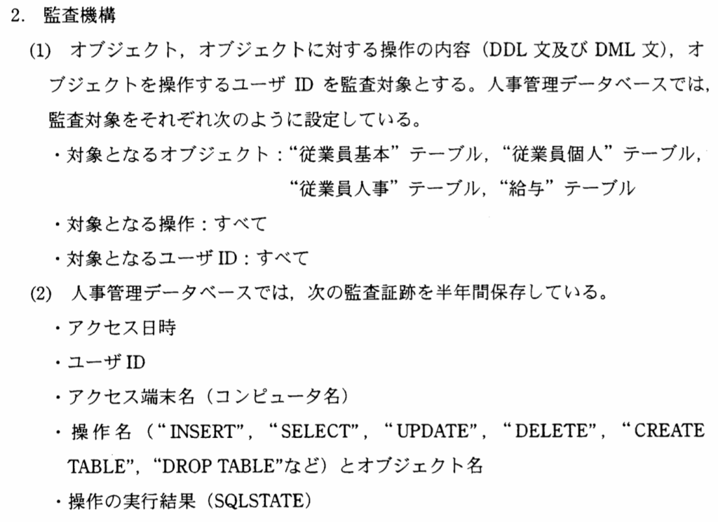 監査機構に関しては、〔RDBMSの仕様と人事データベースの設定内容〕で下記のように記載されている。