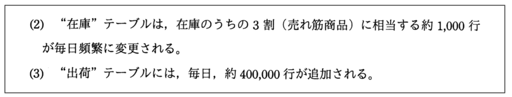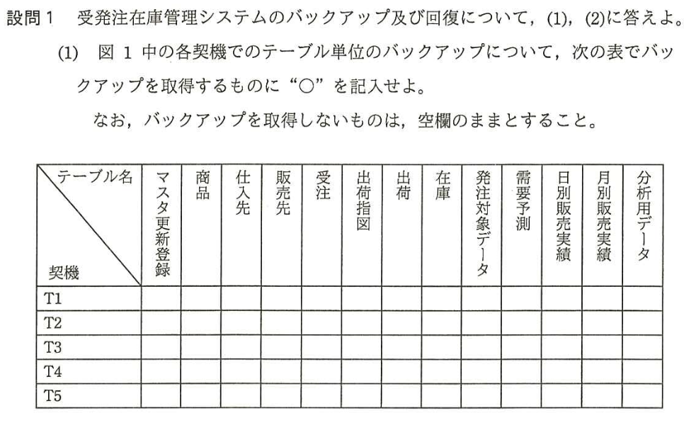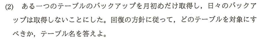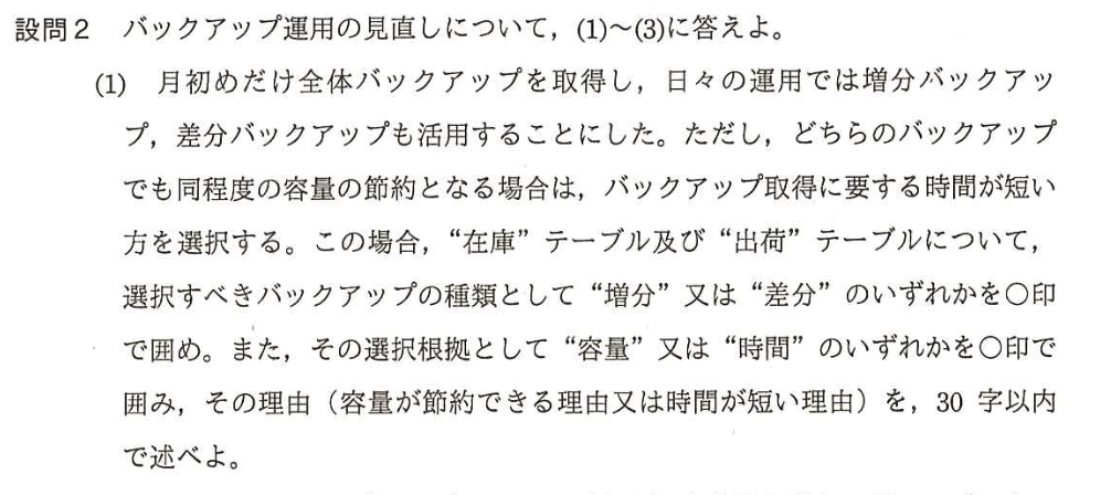 | バックアップの種類 | テーブルごとのデータ変化特性(更新頻度、追加頻度)に基づき、「差分」と「増分」のどちらが容量と時間の面で最適か判断する。特に「在庫」と「出荷」のケースは、更新と追加の特性を理解する良い訓練となる。 |