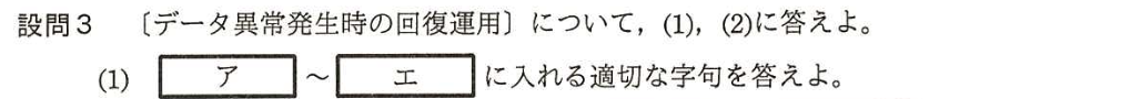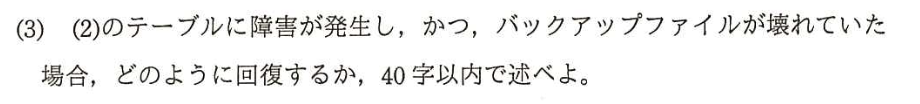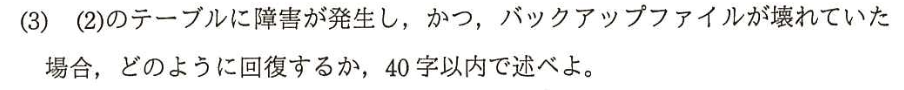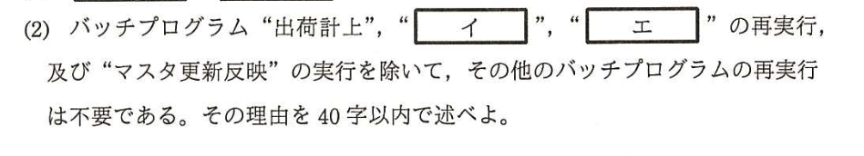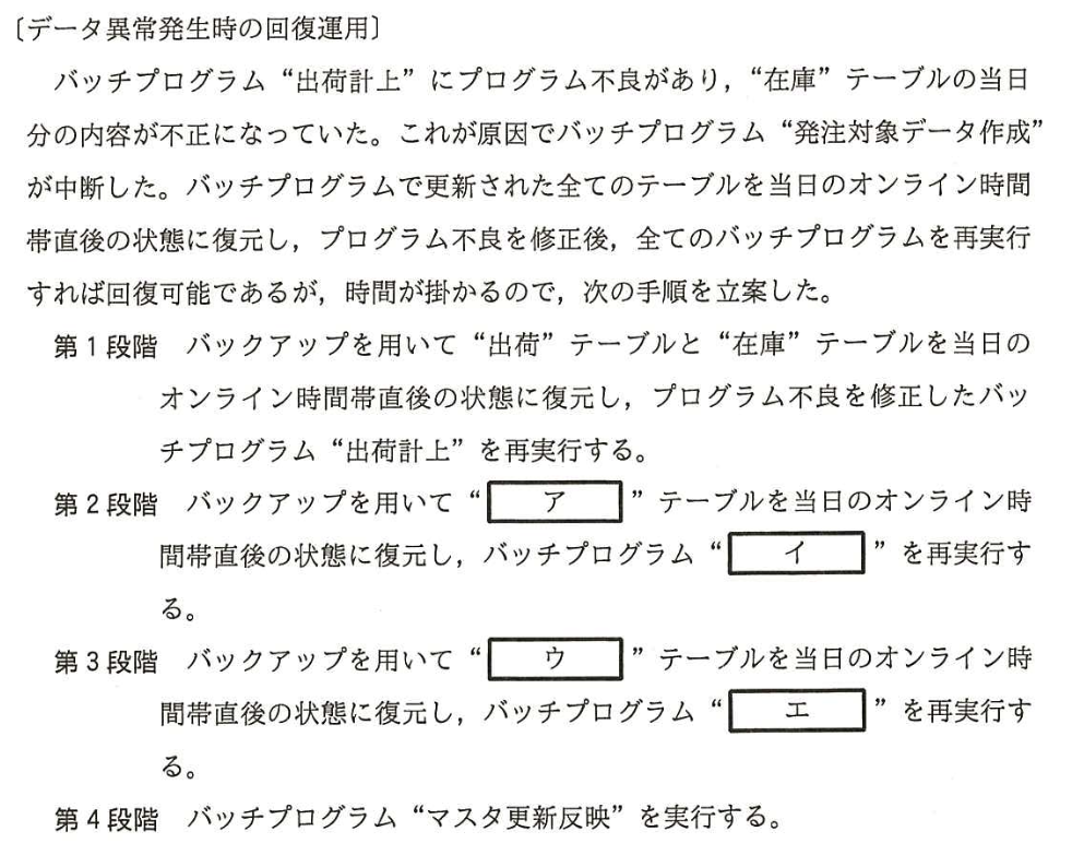 | 再実行の不要な理由 | 影響のないパッチプログラムについて、「なぜ再実行が不要か」を論理的に説明する。解答の要点は「障害の影響を受けたテーブル(とそれを反映したテーブル)を参照していないから」となる。 |