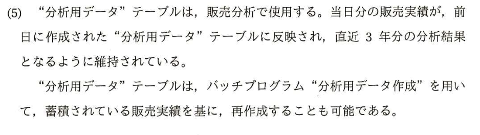 〔プログラムとテーブルの関係〕から、「再作成可能」であることが分かる。したがって、バックアップを月初のみにしても、”販売実績”から再作成可能であり、影響は少ないと考えられるので、『”分析用データ”テーブル』となる。