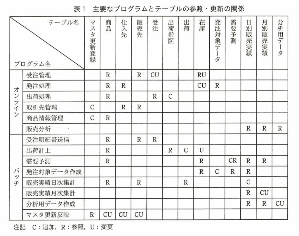 【マスタ更新登録】表1のオンラインの「取引先管理」「商品情報管理」で「C:作成」されるので、〔仕様〕からオンラインプログラムで更新され得るテーブルは、オンライン時間帯直後にバックアップ採取するので、『T1』となる。