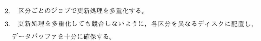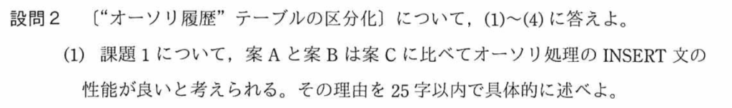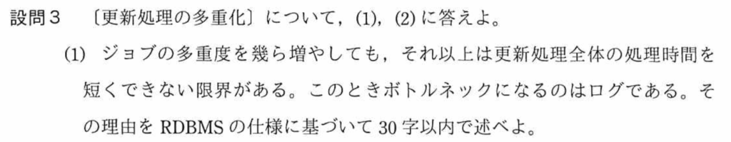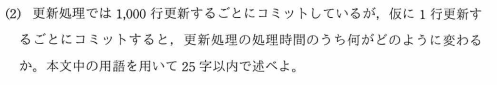 設問3(2)では、更新処理の内、1,000行毎コミットから1行毎コミットで、更新処理の処理時間の内、何がどのように変わるかを考える問題。