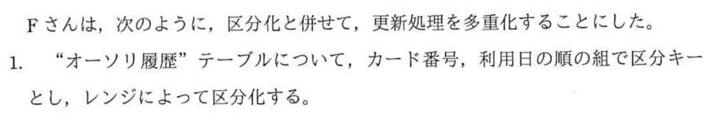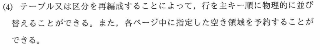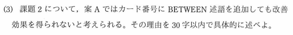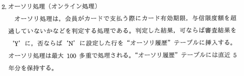 オーソリ処理の処理時間が長くなる理由:一般的に、テーブルに索引を定義すると、検索時間は早くなるが、登録時間は長くなる。新たな行を追加する時に、索引も更新しなければならず、処理時間がかかる。したがって、『順次アクセスの処理時間に影響しないから』となる。
