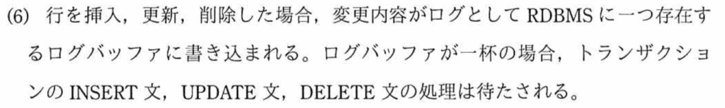 - ログバッファ:変更内容を安全に保存;RDBMSに1つの場合、並列処理不可