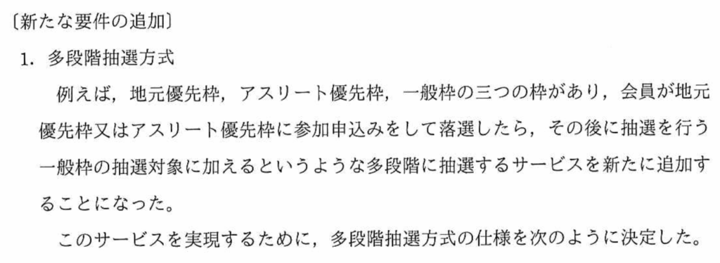 ③;関係”参加申込み”ごとの属性”抽選結果”を削除して、エントリ枠ごとの抽選結果にする。後続エントリ枠が増えたので、エントリ結果ごとに抽選結果を持たせなければ、どのエントリ枠の抽選によるものか分からないからである。つまり、関係”抽選結果”を追加し、属性{大会番号、エントリ枠番号、会員番号、抽選結果}となる。