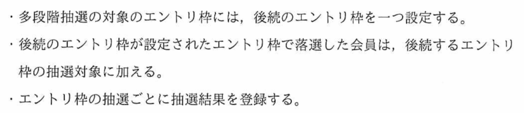 ②後続のエントリ枠が設定されたエントリ枠で落選した会員は、後続するエントリ枠の抽選対象に加える。